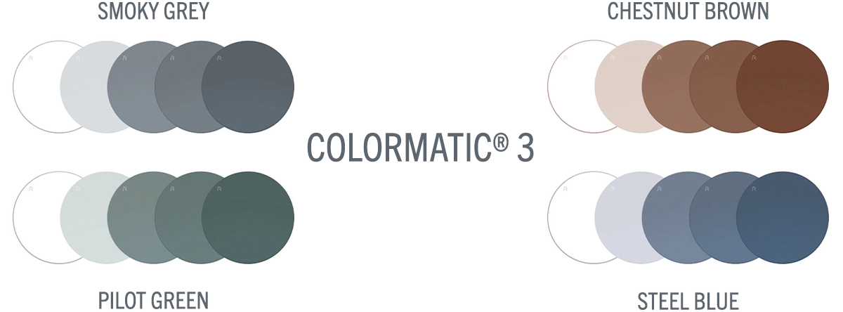 Los lentes ColorMatic® 3 se adaptan automáticamente a la luz: son completamente transparentes en interiores y se oscurecen totalmente en exteriores, con hasta un 88 % de absorción de luz bajo la luz solar. Están disponibles en varios colores, pensados para diferentes necesidades visuales: azul y gris para situaciones de bajo contraste, verde para contraste medio y marrón para alto contraste, aportando además una sensación de mayor calidez visual.
